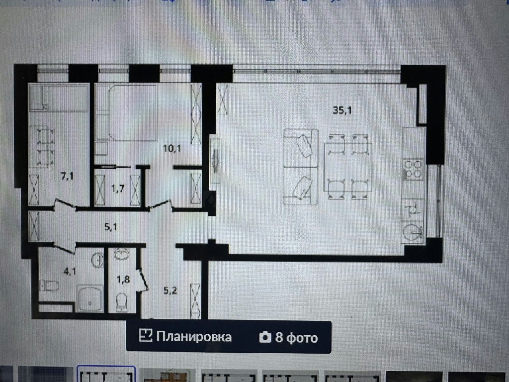 Апартамент свободной планировки, приведен пример планировочного решения. Высота потолков 3.1 м., установлены счетчики на воду, радиаторы отопления.
